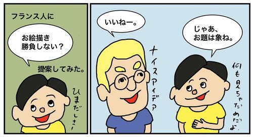 1年目の思い出 40 友人のフランス人と適当にお題を出してお絵かき対決をした時のお話。お題は象さん。勿論、何か参考にしちゃいけない、自分の頭の象を描くのみ。